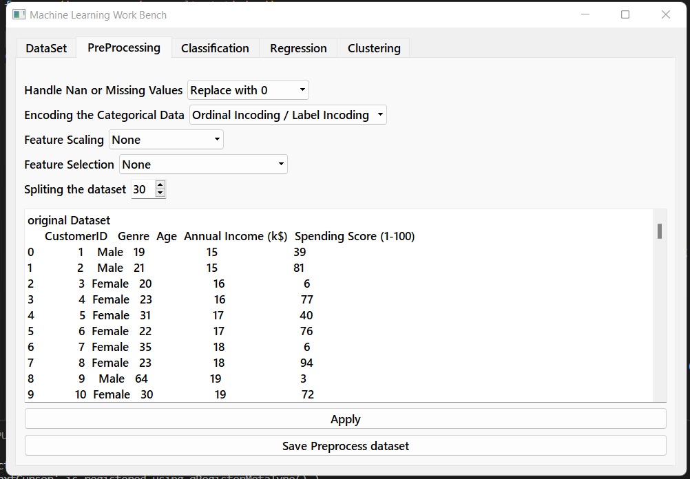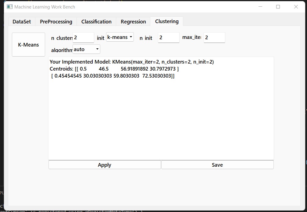 Application of machine learning algorithms is cumbersome task. The process requires deep understanding of mathematical background, selection, and application of different algorithms. To simplify this, our team came up with the idea of developing the Machine Learning Workbench, as our final year project. Our system aims to provide extensive support for the complete process of the experimental data under consideration including; dataset selection, preprocessing, and application of classification, clustering, and regression’s algorithms. Also, this diverse and comprehensive toolkit can be accessed through a common interface so that users can compare different methods and identify those which are most appropriate for the problem at hand.