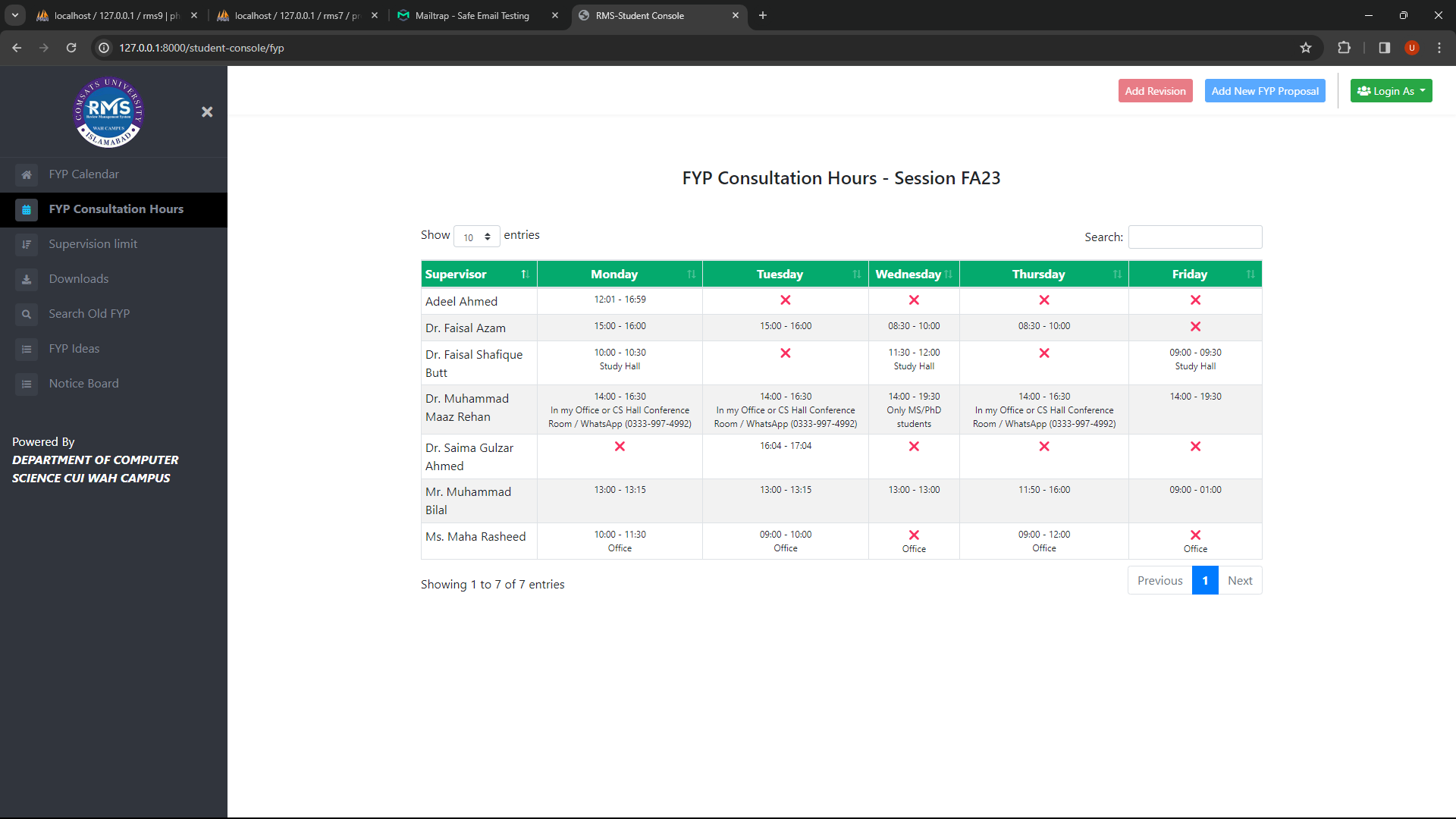 Objectives of RMS (Version 4.0) are: ? Provided all proposal-related elements and overviews into a comprehensive module, empowering coordinator to seamlessly incorporate project streams, along with associated tools, domains, and other pertinent details. ? Implementation of a system to manage and optimize consultation hours for students working on their Final Year Projects (FYP). The Consultation Hours Module enables supervisors to establish their consultation schedules, specifying both time and venue. Simultaneously, students can conveniently check the availability of their supervisors' hours through the student console. ? Within the FYP Ideas Module, supervisors are granted the capability to publish their project concepts, providing students with the opportunity to volunteer for projects aligned with their interests. Students can then select and undertake these projects for their Final Year Projects (FYPs). ? Integration of a module to facilitate the process of drafting and submitting industrial letters for project collaborations. ? Implementation of the NLP Module, an advanced system which utilizes Natural Language Processing (NLP) to assess proposals on a contextual basis, determining whether similar proposals already exist within the system. ? Enhancements to address issues related to supervisor shifts. ? Remaking the Internal/External Evaluation module to allow coordinator to change marking criteria. ? Development of a statistical tracking system to monitor the burden of evaluation team members. ? Sending Emails automatically based on the FYP Calendar to keep supervisors informed about upcoming deadlines. ? Development of an evaluation criteria CRUD to allow coordinator to change marking criteria for each session. ? Overhauling the Create, Read, Update, Delete (CRUD) functionalities and selection process for external examiners to enhance efficiency