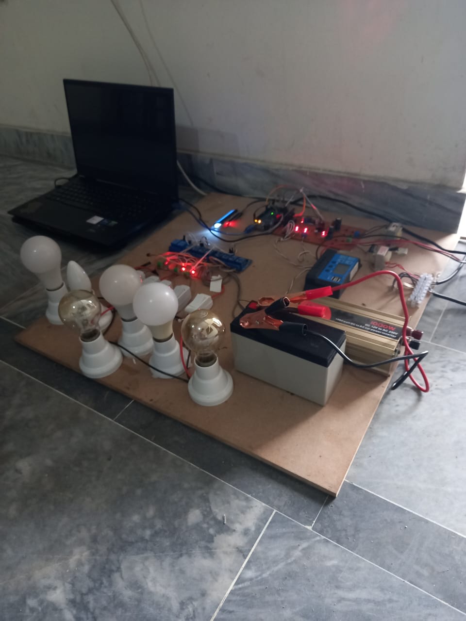 Smart Switching and Optimization: Develop a system capable of intelligent switching between multiple energy input sources (Generator, Wapda, Solar, Battery) to ensure uninterrupted energy supply while maximizing efficiency and sustainability. • System Protection and Islanding Effect: Implement measures to protect the system and loads from faults, utilizing the concept of islanding effect to isolate affected areas and prevent cascading failures, thereby maintaining overall system functionality and reliability. • Comprehensive Monitoring and Analysis: Designing and deploying a mobile application for real-time monitoring of energy consumption metrics and fault detection alerts, providing users with actionable insights into system performance and reliability for informed decision-making. • Efficient Resource Utilization: Employ relay based switching mechanisms to efficiently route power to designated factories, optimizing energy distribution tailored to specific requirements and load types in industrial settings, thereby enhancing operational efficiency and productivity. • Fault Detection and Resolution: Utilize current sensors to detect anomalies in loads, enabling seamless intervention and resolution to ensure smooth operation of the system and mitigate potential disruptions in energy supply, contributing to improved system reliability and uptime.