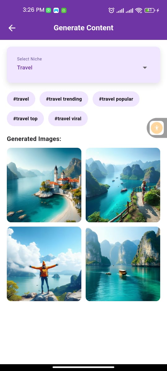 The project automates social media management for Instagram using AI, replacing manual efforts. It includes secure signup with email verification and Facebook login for users with business or creator accounts, enabling API access. The app offers three main features: Create Content, where users select niches to retrieve top hashtags and generate AI-driven posts and captions; Smart Schedule, which schedules posts, provides SEO tips, competitor analysis, and performance tracking; and Audience Performance Benchmark, offering insights and graphical data on audience reach.