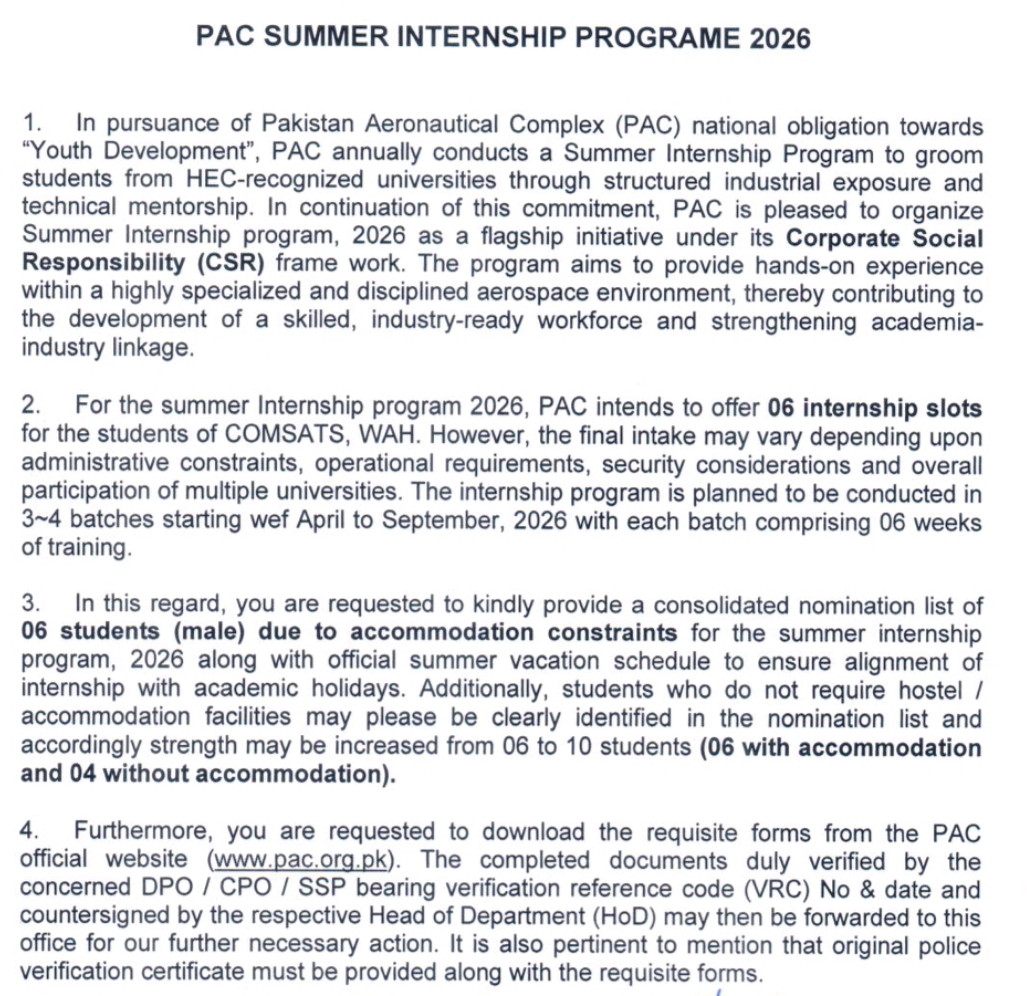 Assalam- O – Alaikum 1. The 8th batch of the DHA Internship Program has been scheduled only for under graduates who have completed their degrees. We would like to have the best interns from your university.The summer internship will start from 1st July 2024.This internship is for 8 to 12 weeks . 2. Entry Test The entry test for the internship program has been scheduled for June 1st, 2024 (Saturday), from 0900 hours to 1700 hours at DHA Senior School for Girls, Faith Hall, G-483 Street 1, Sector G Phase 5 Defence Housing Authority, Lahore. The test will consist of multiple-choice questions (MCQs) a. 60 marks of the marks focused on your field of education/internship b. 20 marks on English language proficiency c. 10 marks on interview assessment d. 10 marks on practical IT skills evaluation e. Total 100 marks 3. Eligibility a. Student who have completed 6th or7th semester only b. Min CGPA 2.7 All eligible candidates should fill the Google form provided in the link below and attach the necessary supporting documents as soon as possible but not later than 30 April 2024. 4. Google Form:- https://docs.google.com/forms/d/1pNisQBnRFHMZyKDenJ7kxqsg9YobVmTVmcJaMDumvzw/edit?usp=forms_home&ths=true 4. If you have any queries or require further assistance, please do not hesitate to contact us on following telephone numbers 1. 042-99062131 2. 042-99062132 3. 042-99062135