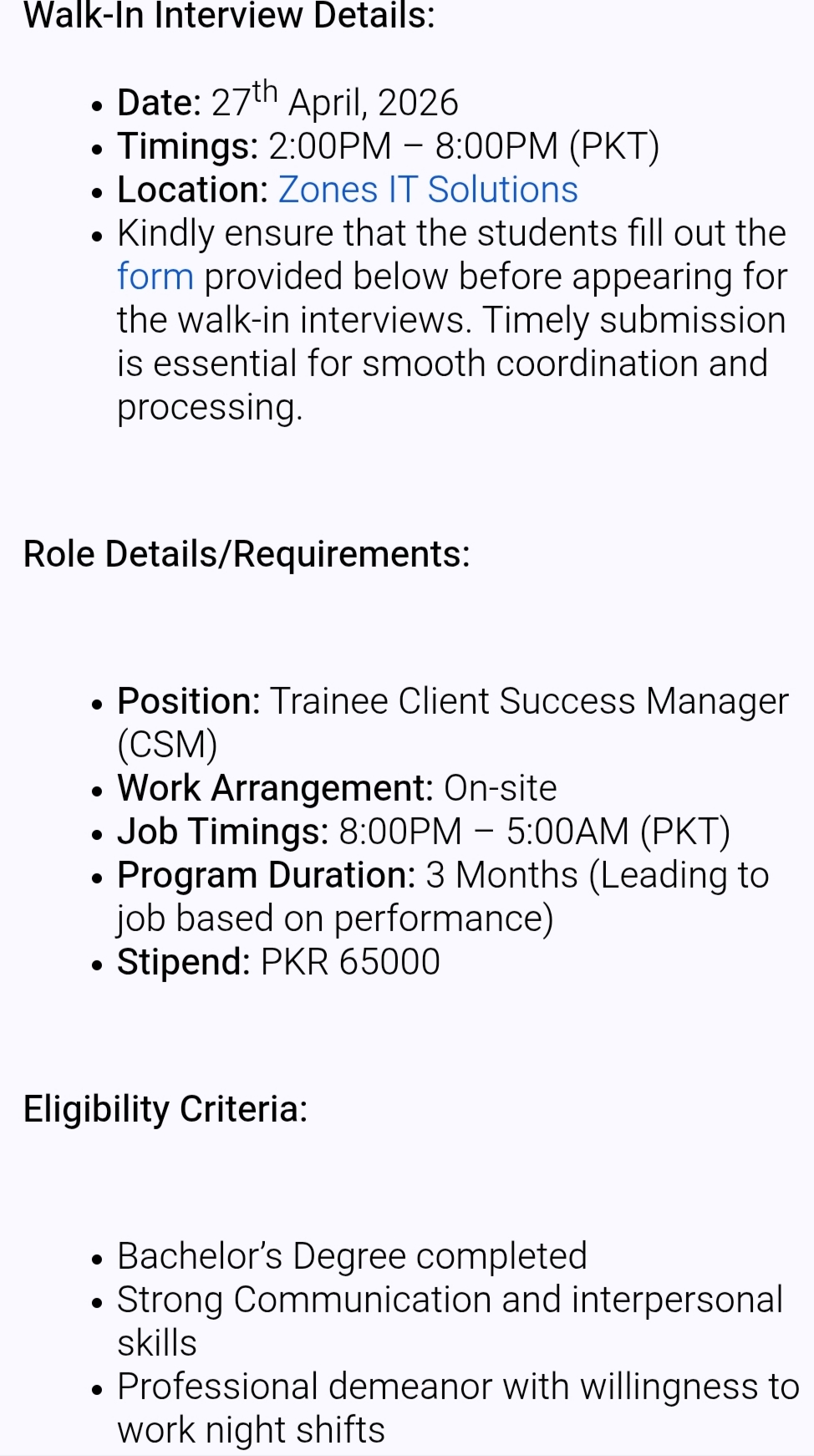 Location: Islamabad, RawalpindiMinimum Education: Bachelor